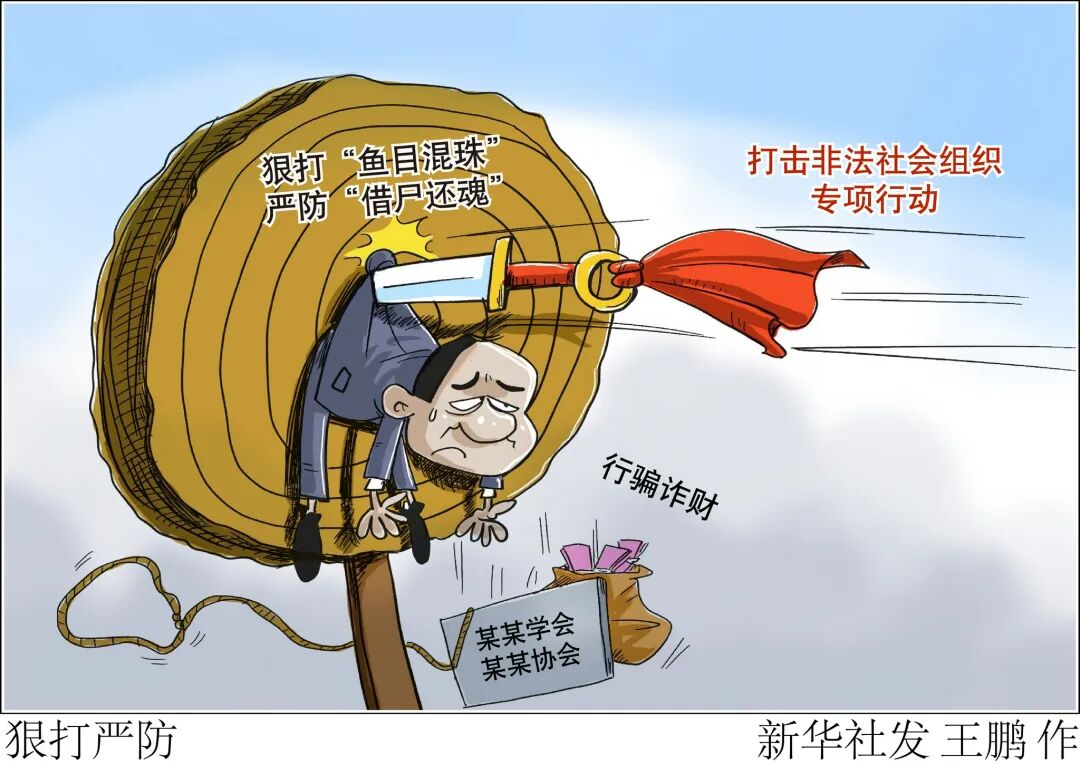 非法社会组织的危害不容小觑。非法社会组织惯用的伎俩是“拉大旗作虎皮”,要么冠以“国字号”等高大上的名头,要么冒用国家机关、事业单位等名义,误导受众相信其“权威性”和“真实性”,以便从事各类不法活动。有的开展非法集资,严重威胁人民群众财产安全;有的冒用国家重大项目名义实施诈骗,严重损害政府和有关部门的公信力;更有甚者,充当境外敌对势力的爪牙,妄图破坏我国社会和谐稳定……凡此种种,劣迹斑斑,非法社会组织犹如寄生在社会肌体上的“毒瘤”,必须坚决打击铲除。