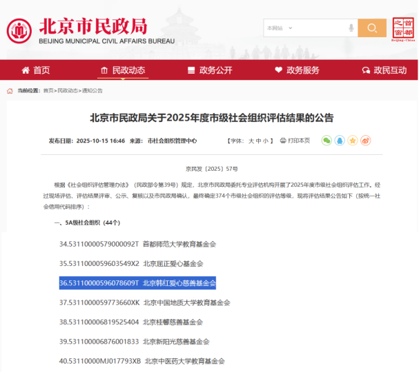 【志愿服务北京熏】根据《社会组织评估管理办法》(民政部令第39号)规定,今年7月,北京市民政局委托专业评估机构从党的建设、内部治理、诚信建设等多维度对韩红基金会进行评估与审核。近日,北京市民政局发布《北京市民政局关于2025年度市级社会组织评估结果的公告》,最终评选我会为5A级社会组织。