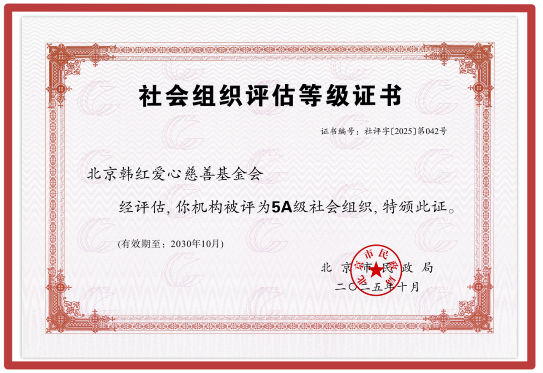 2020年,北京韩红爱心慈善基金会被评为北京市5A级社会组织,时隔5年,我会再度获评5A级社会组织,这标志着基金会在规范化运作、专业能力与社会公信力等多方面持续获得高度认可。积极参与社会组织等级评估工作,也是韩红基金会以评促建、不断检验自身管理治理工作的重要方式。